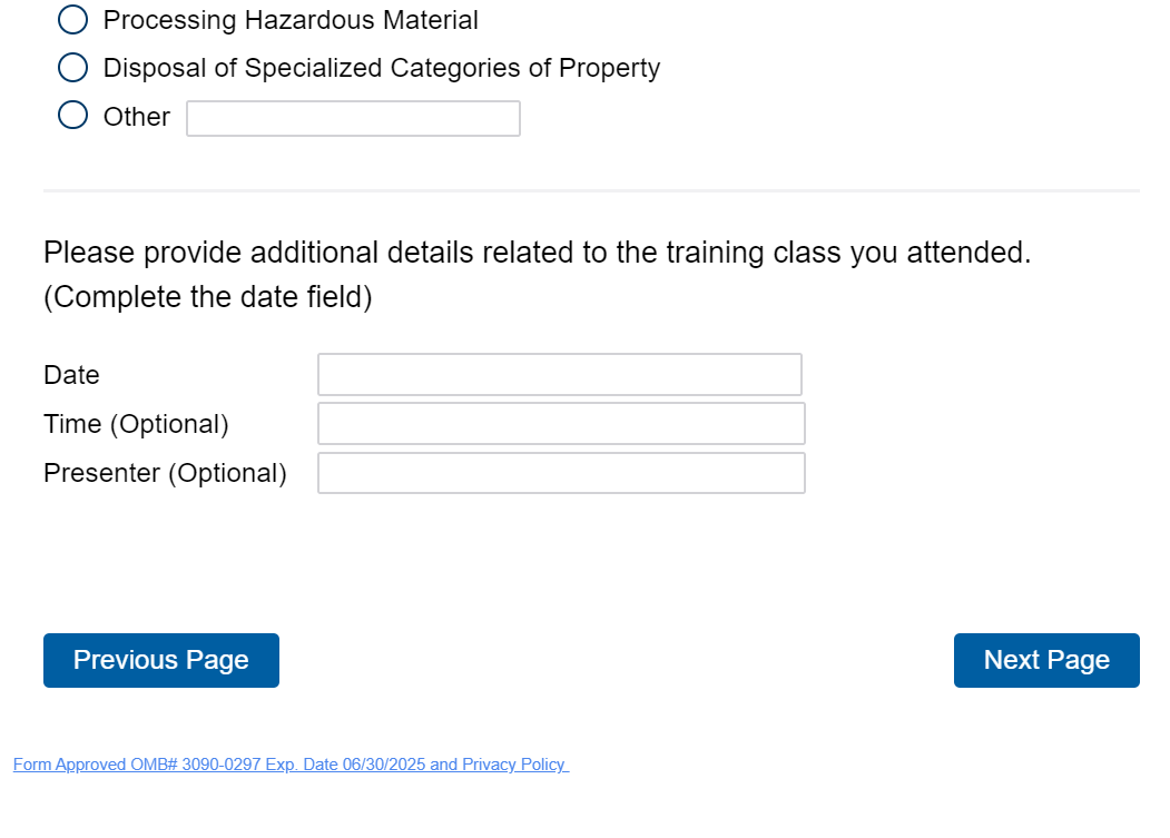If the respondent selects “yes”, it takes them to the below training website that is updated on a continuous basis: https://www.gsa.gov/about-us/events-and-training/gsa-events