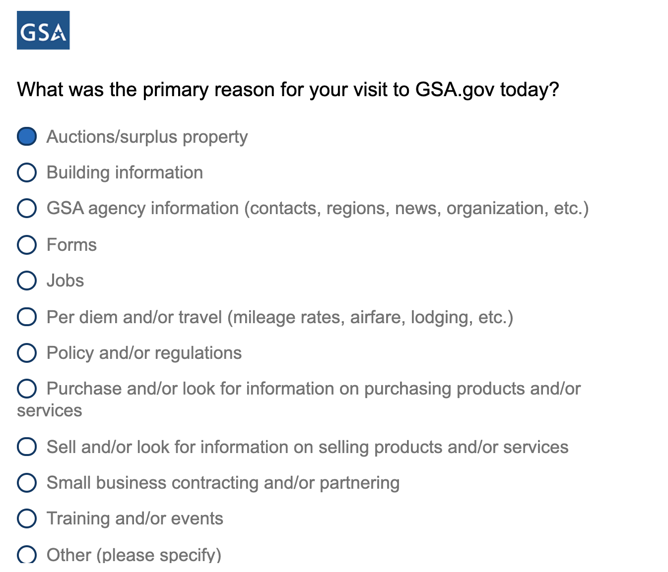The survey outlined in this walkthrough document will collect user feedback on the GSA.gov website. Data collected here will inform our user-centered approach in maintaining and improving our website and digital experience.
