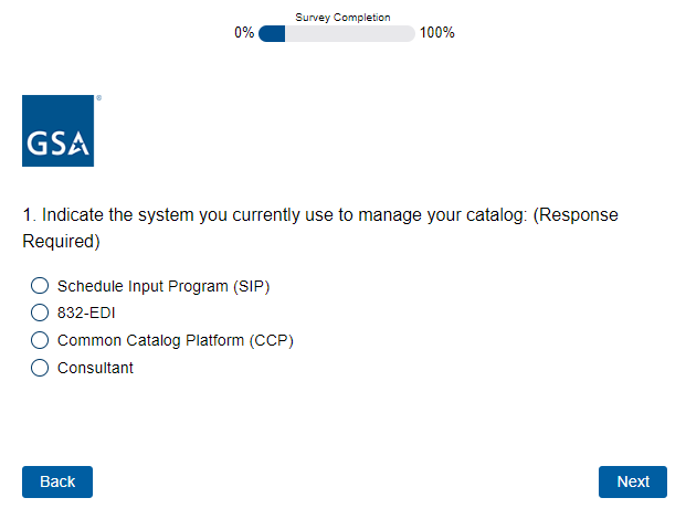 Survey Description for Participants: The Catalog Management Office is collecting information to better user experience during the transition process to the Common Catalog Platform. The survey should take approximately 1 minute to complete. Please answer the following questions based on the system you currently use to manage your catalog. Send any questions to CatalogManagement@gsa.gov. Paperwork reduction act statement