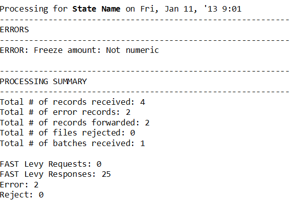 State Error File (ERQ) – Generated by the FAST Levy system in response to the receipt and validation of a state request. This contains the errors found in these files.