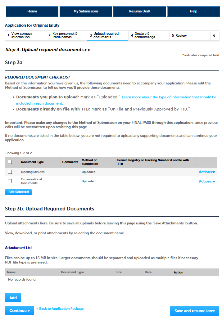 Application for Original Entity – Step 3 Upload Required Documents Screens: