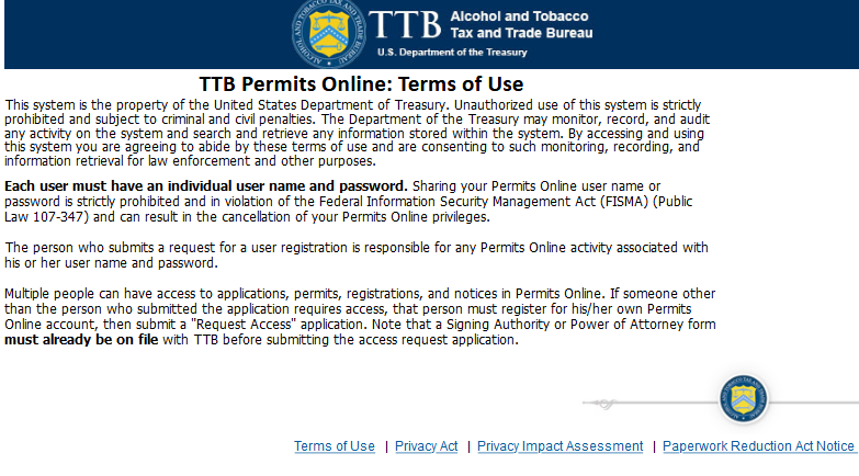 On the screen shown above, a New Brewer’s Notice applicant will select “Apply for new permits, registrations or notices.” Users will then see the following PONL Rules and Responsibilities page.