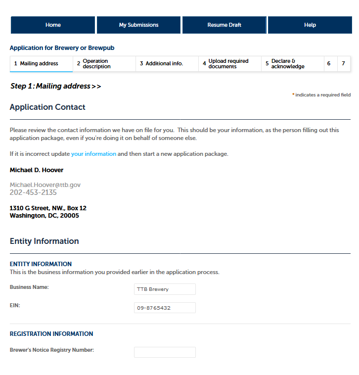 Application for Brewery or Brewpub, Step 1 – Mailing Address Screens: