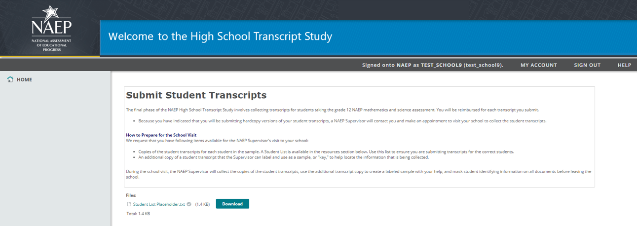 Description of the HSTS Website: The NAEP State and TUDA Coordinators or school HSTS coordinators, depending on how tasks are designated, are responsible for providing information and materials for the study, including course catalogs and student transcripts, using the HSTS website, which is an online secure file-sharing site. The HSTS website serves as the primary resource and action center throughout the data collection period and is provided in this document.