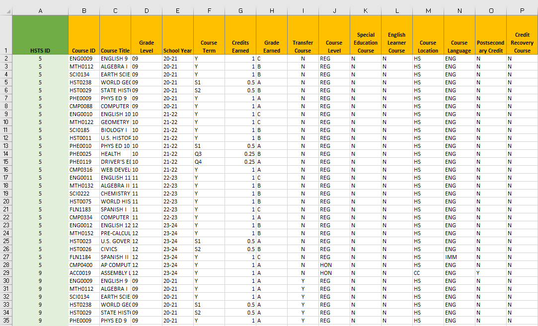 1 Required fields for HSTS transcript files are: HSTS ID (provided by NAEP on the student list), Course ID, Course Title, Grade Level, School Year, Course Term, Credits Earned, Grade Earned, Transfer Course (Y/N indicator), and Graduation Status.