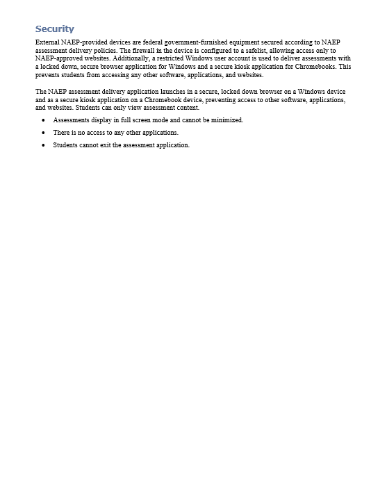 Gracias por su apoyo a la Evaluación Nacional del Progreso Educativo (NAEP, por sus siglas en inglés). Esperamos trabajar con usted para hacer de NAEP una experiencia positiva en su(s) escuela(s). Cada escuela tiene un(a) director(a) de tecnología distrital y un(a) coordinador(a) de tecnología interno(a) designados, quienes son responsables de gestionar los requisitos tecnológicos para la evaluación de NAEP. El objetivo del equipo de NAEP es conectar los dispositivos proporcionados por NAEP al WiFi de la escuela para la evaluación. Al trabajar en equipo con su(s) coordinador(es) escolar(es), usted puede asegurarse de que todo transcurra sin inconvenientes el día de la evaluación.