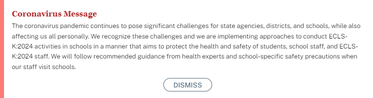 The coronavirus pandemic continues to pose significant challenges for state agencies, districts, and schools, while also affecting us all personally. We recognize these challenges and we are implementing approaches to conduct ECLS-K:2024 activities in schools in a manner that aims to protect the health and safety of students, school staff, and ECLS-K:2024 staff. We will follow recommended guidance from health experts and school-specific safety precautions when our staff visit schools.