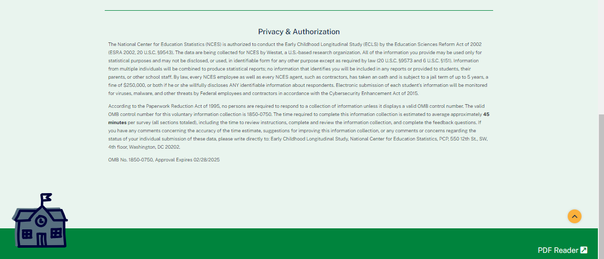 According to the Paperwork Reduction Act of 1995, no persons are required to respond to a collection of information unless it displays a valid OMB control number. The valid OMB control number for this voluntary information collection is 1850-0750. The time required to complete this information collection is estimated to average approximately 40 minutes per survey, including the time to review instructions and to complete and review the information collection. If you have any comments concerning the accuracy of the time estimate, suggestions for improving this information collection, or any comments or concerns regarding the status of your individual submission of these data, please write directly to: Early Childhood Longitudinal Study, National Center for Education Statistics, PCP, 550 12th St., SW, 4th floor, Washington, DC 20202.