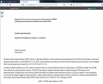 According to the Paperwork Reduction Act of 1995, no persons are required to respond to a collection of information unless such collection displays a valid OMB control number. The valid OMB control number for this voluntary information collection is 1850-0888. The time required to complete this information collection is estimated to average up to [45/60] minutes per [teacher/school administrator], including the time to review instructions, gather the data needed, and complete and review the information collection. If you have any comments or concerns regarding the accuracy of the time estimate(s), suggestions for improving the form, or questions about the status of your individual submission of this form, write directly to: Teaching and Learning International Survey (TALIS), National Center for Education Statistics (NCES), Potomac Center Plaza, 550 12th Street, SW, 4th floor, Washington, DC 20202.