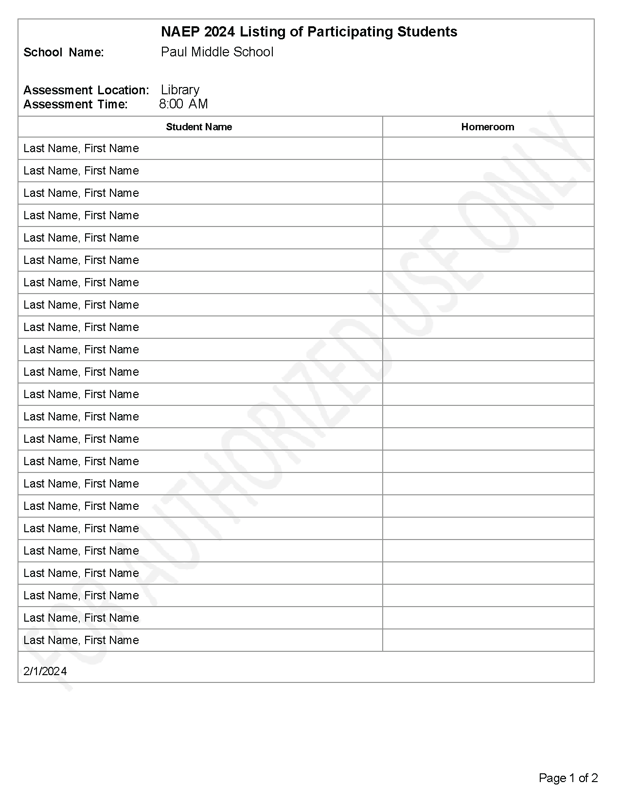 NAEP needs a complete Excel file of students enrolled during the 2023–2024 school year for the selected grade(s) at your school. Schools selected for multiple grades should create separate files for each grade. NAEP uses this student list to draw a random sample of students to participate in the assessment. Include all students in the selected grade, even students who are typically excluded from other testing programs, such as students with IEPs (SD) and English Learners (EL), and students participating in virtual/remote learning.