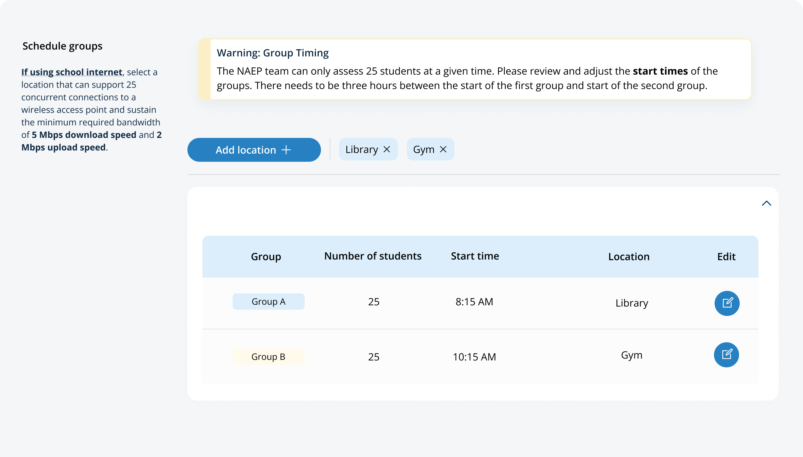 NCES estimates the time required to complete this information collection to average 270 minutes for schools that do not submit student sample information or 390 minutes for schools that submit student sample information manually, plus an additional 10 minutes for each student identified as SD or EL, plus an additional 25 minutes to complete technical activities, plus an additional 60 minutes for schools participating in High School Transcript Study (HSTS) and an additional 150 minutes for schools submitting HSTS materials electronically, including the time to review instructions, search existing data resources, gather the data needed, and complete and review the information collection. This voluntary information collection was reviewed and approved by OMB (Control No. 1850-0928). If you have any comments concerning the accuracy of the time estimate, suggestions for improving this collection, or any comments or concerns regarding the status of your individual submission, please write to: National Assessment of Educational Progress (NAEP), National Center for Education Statistics (NCES), Potomac Center Plaza, 550 12th St., SW, 4th floor, Washington, DC 20202, or send an email to: nces.information.collections@ed.gov.