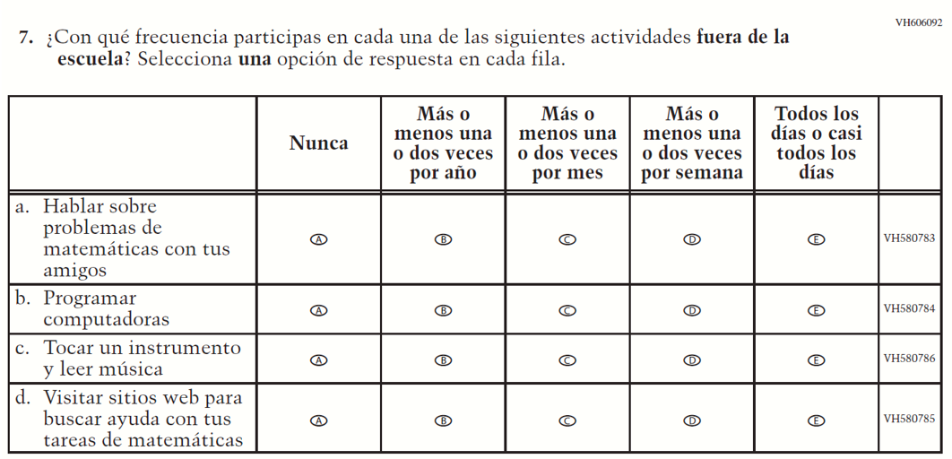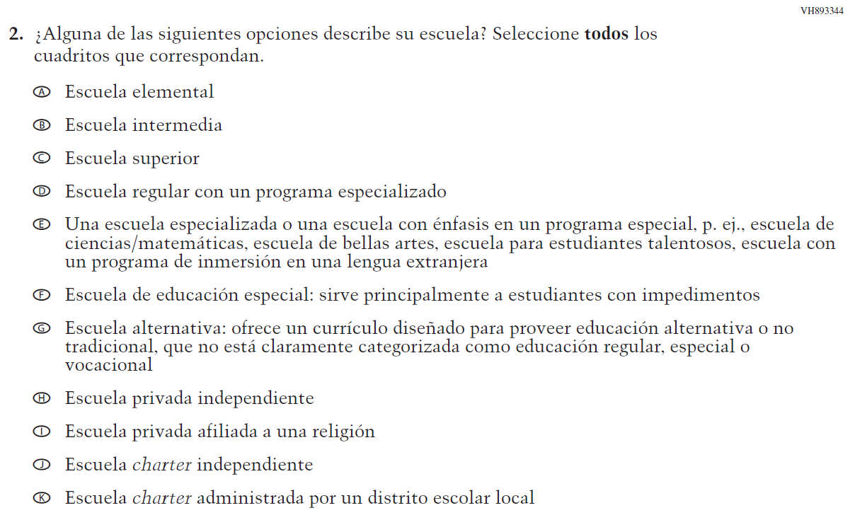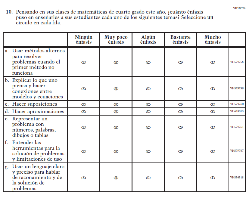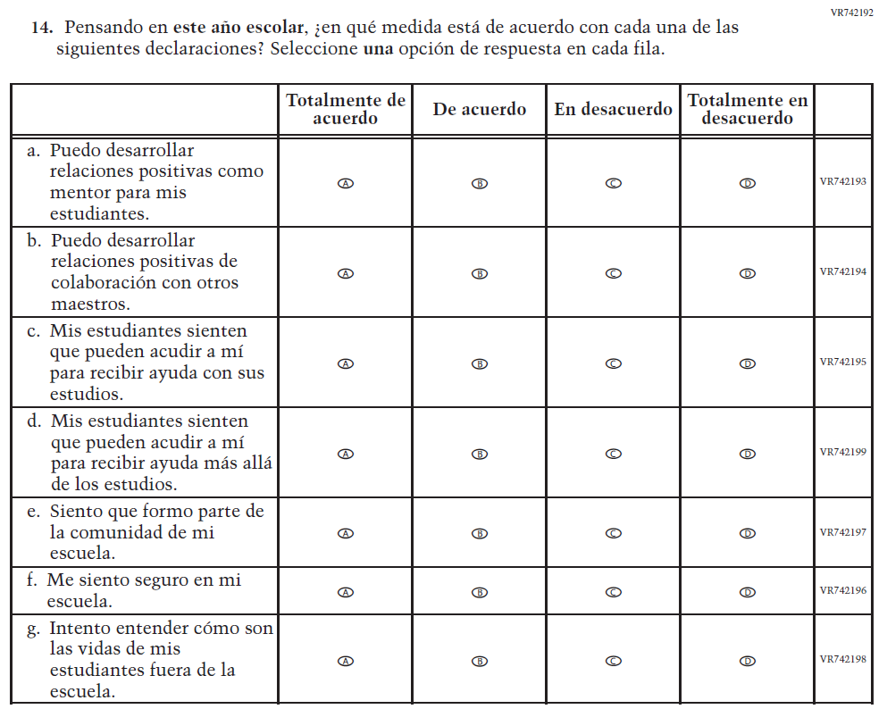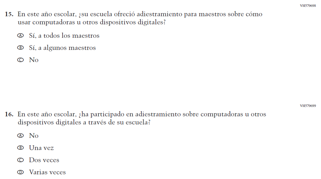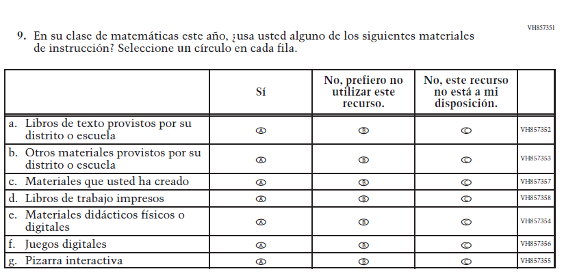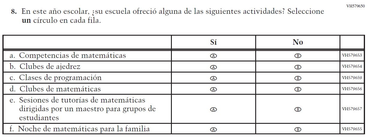 Appendix J-S provides Spanish student, teacher, and school survey questionnaires that will be administered in 2024. Grades 4 and 8 Core, Math, and Reading questionnaires were previously approved in 2022 (OMB# 1850-0928 v.28), and any changes to the items from the 2022 administration are reflected in summary tables. Additionally, grade 8 Science was previously approved in 2019 (OMB# 1850-0928 v.15), and any changes to the items from the 2019 administration are reflected in summary tables. Please note, some of the numbers of the items may be missing or out of order in these printed versions. This will be corrected in the platform view.