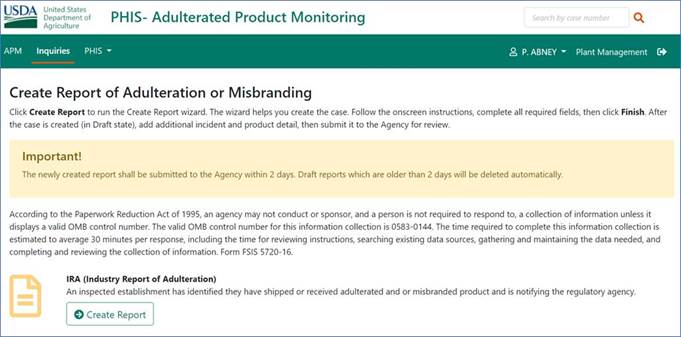 PHIS screenshot for 0583-0144 electronic data collection report of adulteration or misbranding