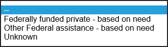 This page collects and/or displays information regarding the type of Federal Income based on need being alleged or received, and the amount.