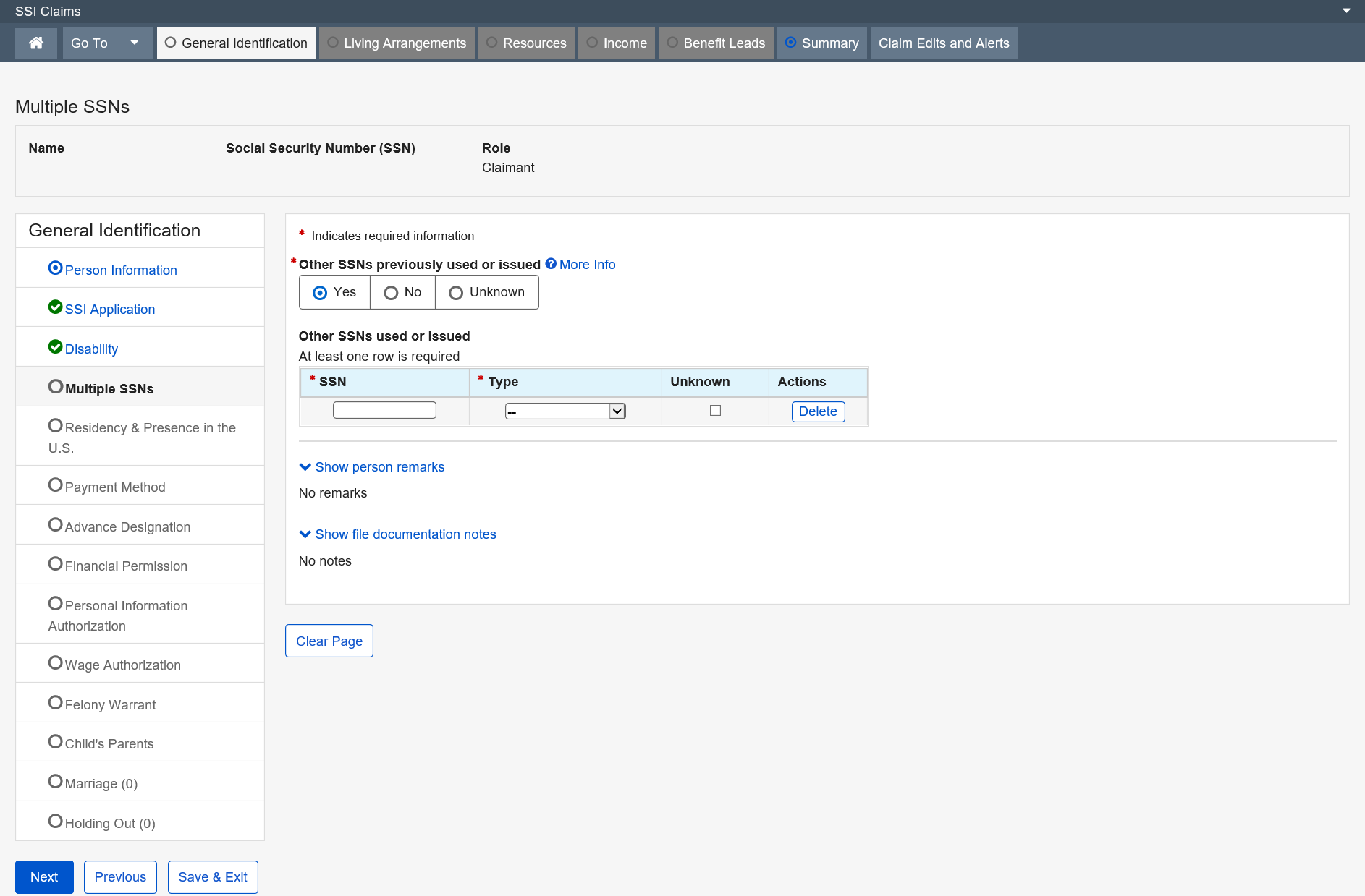 This page collects and/or displays information regarding the type of Social Security being alleged or received and the amount. It is updated by the user, iClaim and the Master Beneficiary Record (MBR) interface with SSI systems.