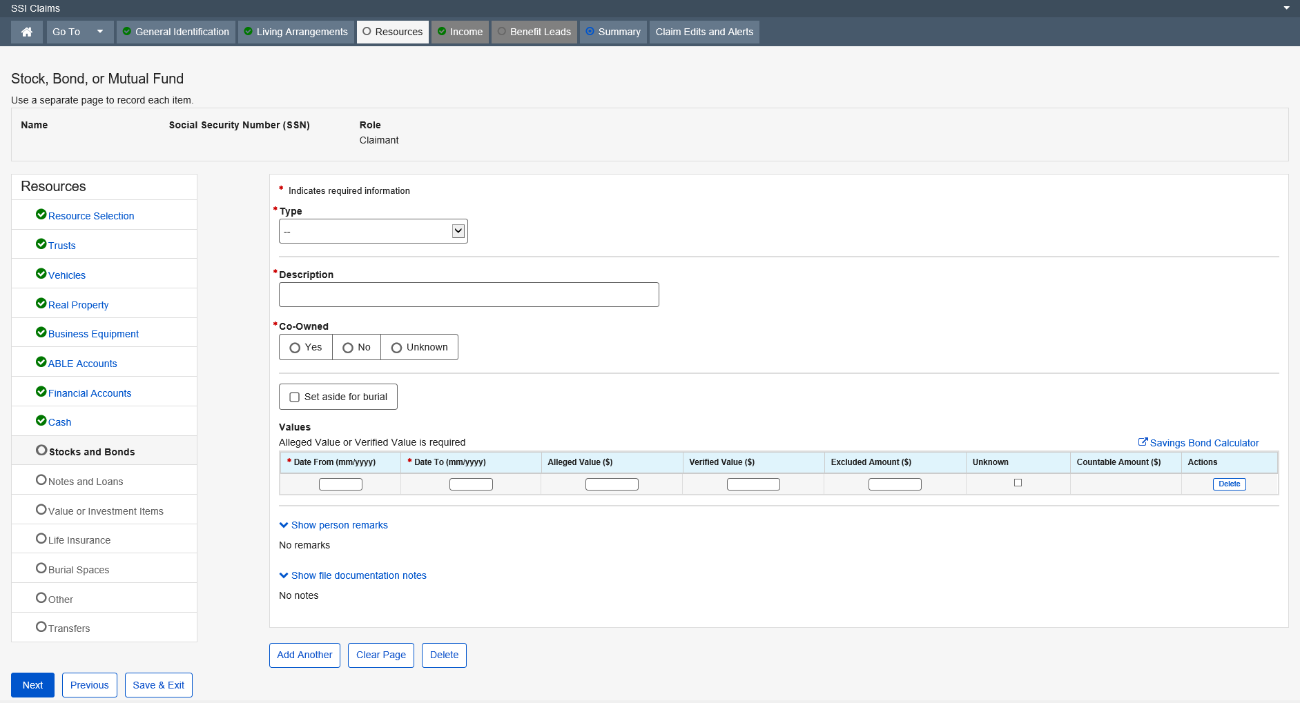 Resources Summary is an optional page that provides a condensed display of the resource data that has been collected in the detailed resource data groups for a Supplemental Security Income (SSI) claimant or deemor. In addition, the person’s countable resources are totaled in Resources Summary to aid Claims Representative's in their review of the claim or in performing manual resource deeming computations. Resources Summary is entirely propagated or derived and no data can be changed on this data group.