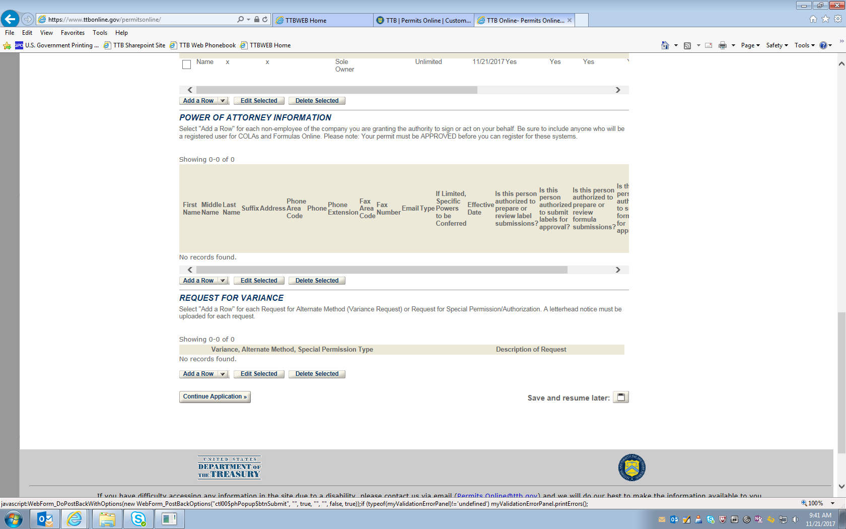[The screens that follow allow the user to review the submitted information and then submit the completed application to TTB.]