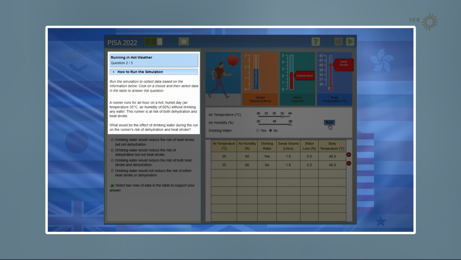 Many of the PISA questions are designed to simulate experiments, letting you manipulate different variables or conditions to produce data that will help you answer the question.