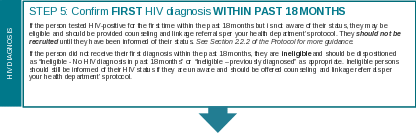 In addition, you should check whether the potential participant is aware of their HIV status by looking into eHARS or other supplementary sources of information. For example, a single report in eHARS with no subsequent visits to an HIV provider and no additional CD4 or viral load tests may indicate that the person may not be aware of their status. |