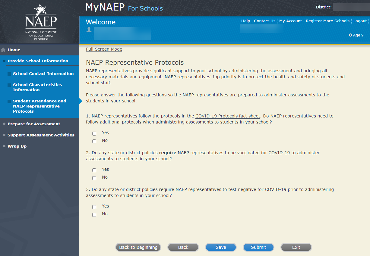This Appendix F2 (formerly Appendix I4) was used in the 2022 Long-Term Trend Age 13 administration and reflected the MyNAEP system screens used by schools to communicate with and transmit information to NAEP. A newer version of MyNAEP, now known as the Assessment Management System (AMS), is replacing this older MyNAEP system across all NAEP assessments. NAEP is currently updating the AMS in preparation for 2025 LTT. As such, the new AMS screens are not yet available for this Clearance Package. The screens and text in this Appendix F2 will be adapted for 2025 LTT Amendment #2 and will be available for review in Appendix F in Summer 2024. See also Appendix F1 for more on the forthcoming Appendix F.