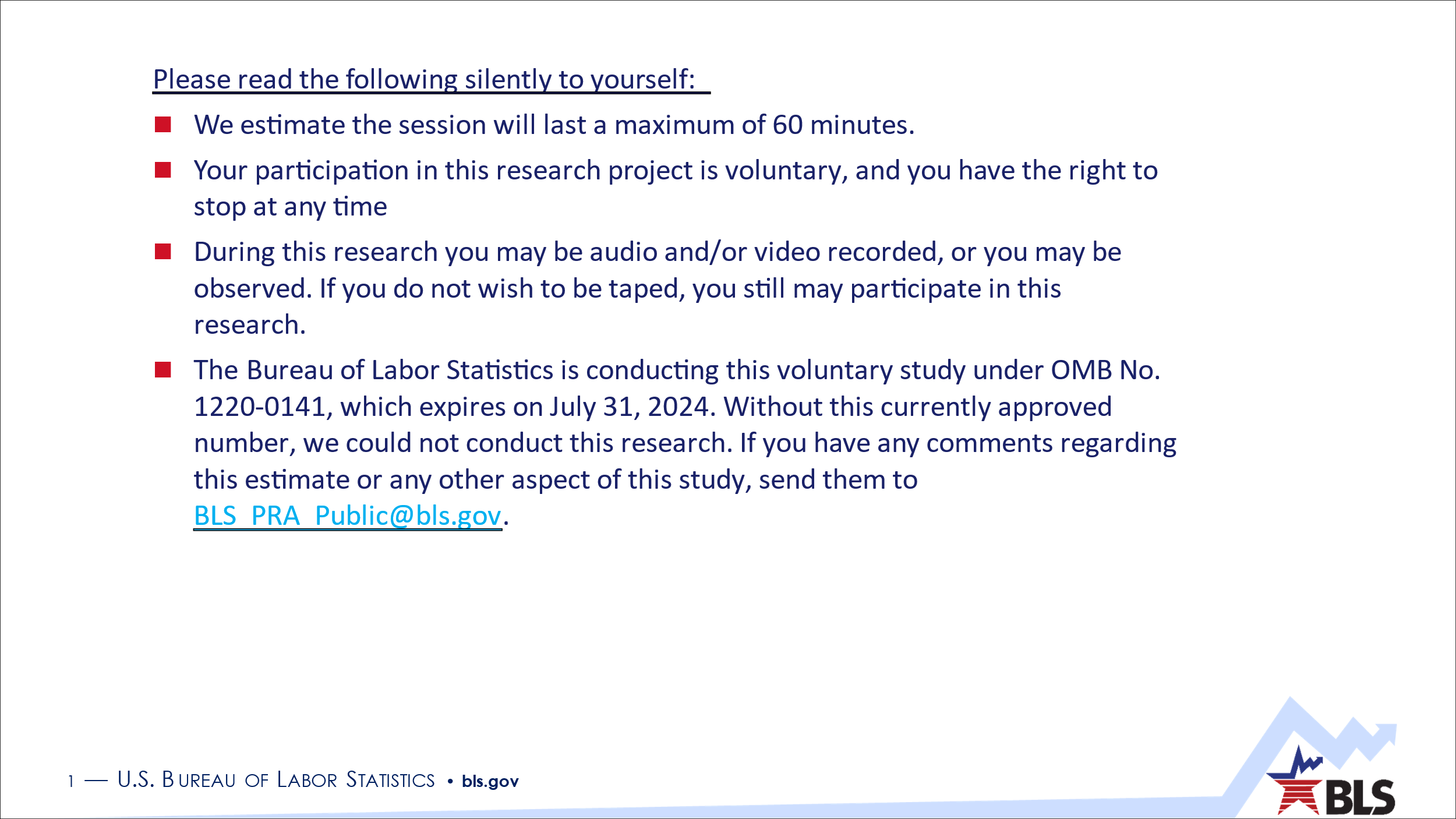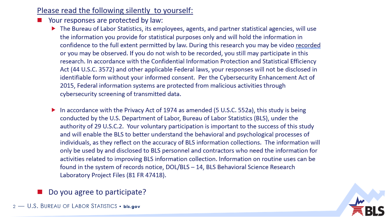 Hello, my name is ______________ and I work at the Bureau of Labor Statistics. Thank you for taking the time to talk with me today. I’m joined by my colleague __________ today, who will be observing and taking notes.