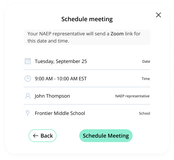 On the modal pop-up, the school coordinators will be able to select a date and time that their NAEP representative is available and schedule the assessment planning meeting to review and confirm school information prior to assessment day.