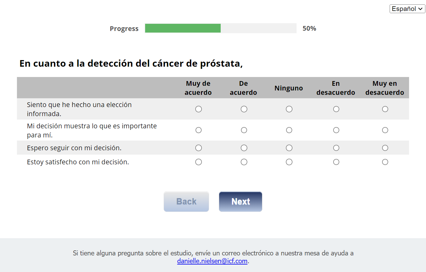 ¿Quién envía esta encuesta? ICF es una empresa consultora que trabaja con la División de Prevención y Control del Cáncer (Division of Cancer Prevention and Control; DCPC) de los Centros para el Control y la Prevención de Enfermedades (Centers for Disease Control and Prevention; CDC) para evaluar distintas ayudas para tomar decisiones sobre los exámenes de detección del cáncer de próstata y su capacidad para ayudar a los hombres de 55 a 69 años a tomar la decisión de hacerse o no la prueba del PSA.