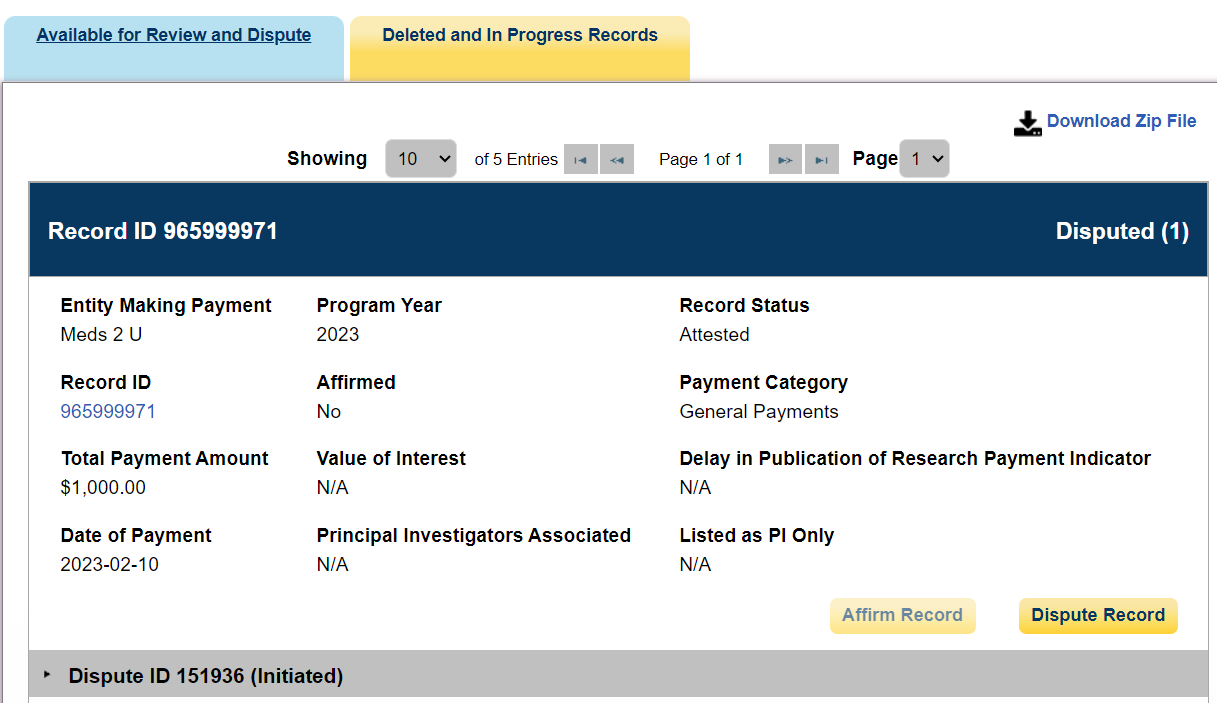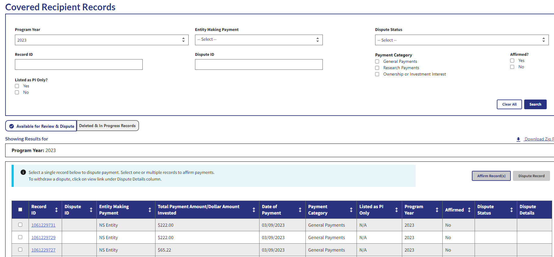 Step 4: Select the Show Records button to navigate to the “Review and Dispute” page for the covered recipient.