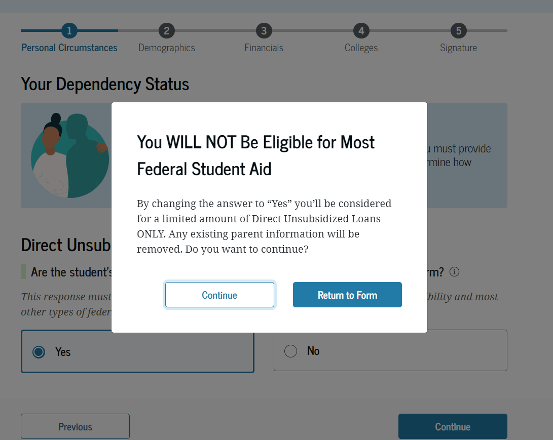 Selecting Continue takes them to the next page in the form. Selecting Return to Form closes the modal and returns them to the unsub only question.