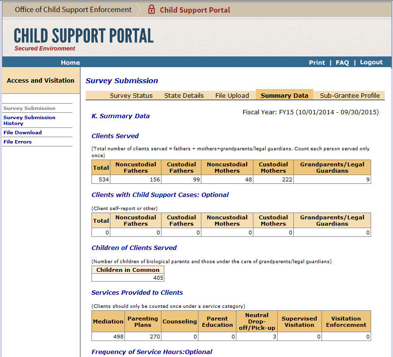 • Fields must indicate the number of clients receiving the following services: Mediation, Development of Parenting Plan, Counseling, Parent Education, Neutral Drop-Off/Pick-up, Supervised Visitation, and Visitation Enforcement.