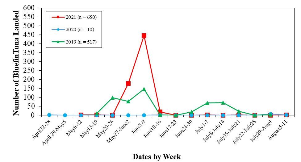 Maryland Catch Card Census weekly landings of bluefin tuna, 2019 to 2021. |