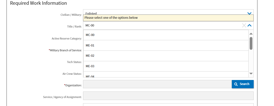 Enlisted: if user selects “enlisted”, the list of values shows the following: