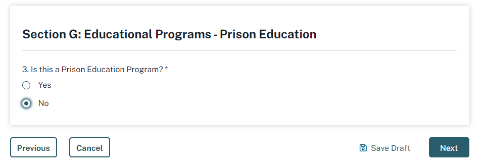 And a second question from the Prison Education Program Application displayed on the next screen, which only displays if the location is a correctional facility: