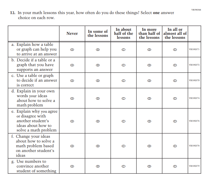 Due to the addition of the Learning Recovery Items, and to further reduce the expected response time at Grade 12, this Item was selected to be dropped. |