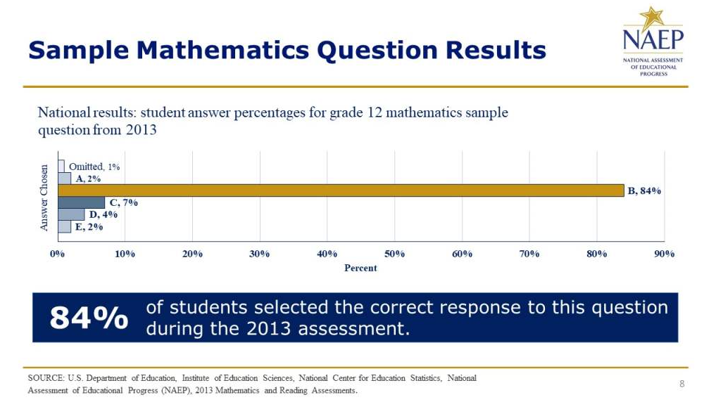 The National Assessment of Educational Progress (NAEP), often called The Nation’s Report Card, is the largest nationally representative and continuing assessment of what students in the United States know and can do in various subjects. Since 1969, NAEP has been a common measure of student achievement across the country in civics, mathematics, reading, science, U.S. history, and many other subjects. NAEP report cards provide national results, as well as results for states, some districts, and various demographic groups, depending on the assessment. Federal and state policymakers, educators, and researchers use NAEP results to assess student progress and develop ways to improve education across the country and ensure that all students have the opportunity to succeed.