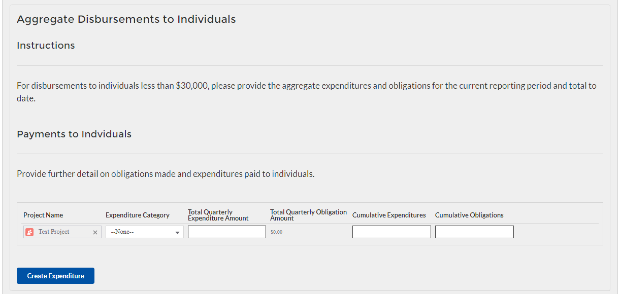 Manually enter the Expenditure Start, Expenditure End, and Expenditure Amount.