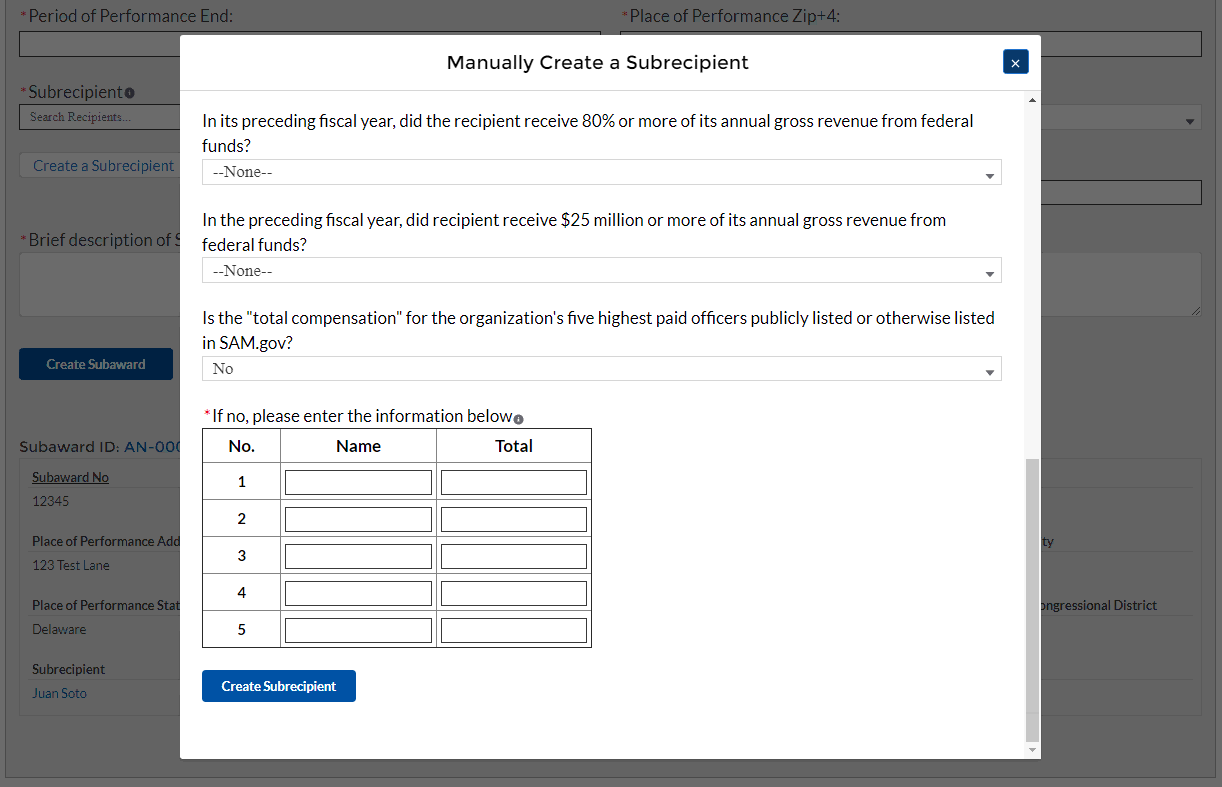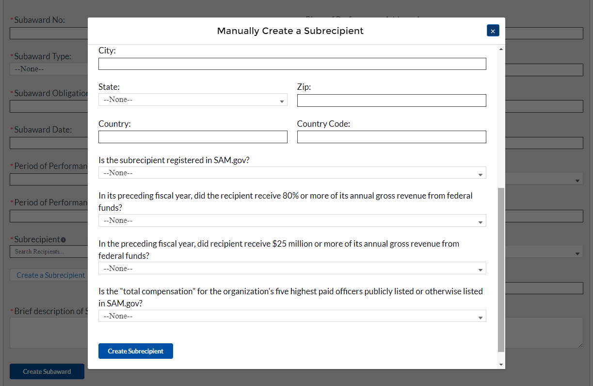 Once you have filled in the information, click Create Subaward to finalize the data entry.