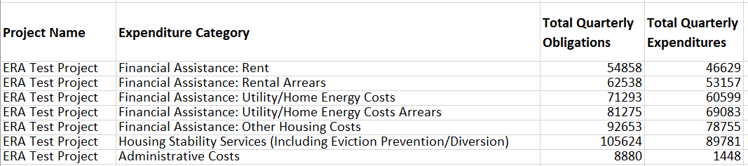 For subawards, contracts and direct payments to direct payees (including to beneficiaries) valued at less than $30,000, report the aggregate amount of all obligations and aggregated amount of all expenditures. This reporting must be performed up to 24 times (reported by 8 Expenditure Category types across 3 Aggregate Types). This will be reported on the Expenditures Tab under the Total of all Obligations and Total of all Expenditures Associated with the ERA2 Recipient’s Subawards, Contracts, and Direct Payments Valued at Less than $30,000 section.
