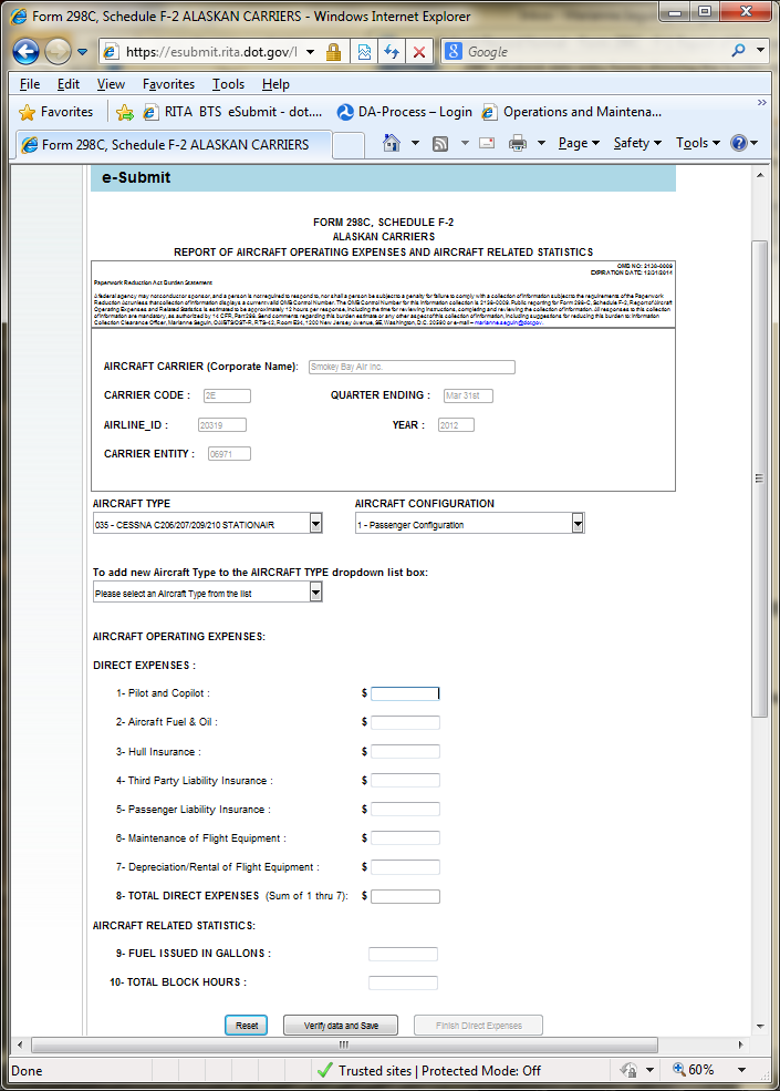 reporting for Form 298-C, Schedule F-2, Report of Aircraft Operating
