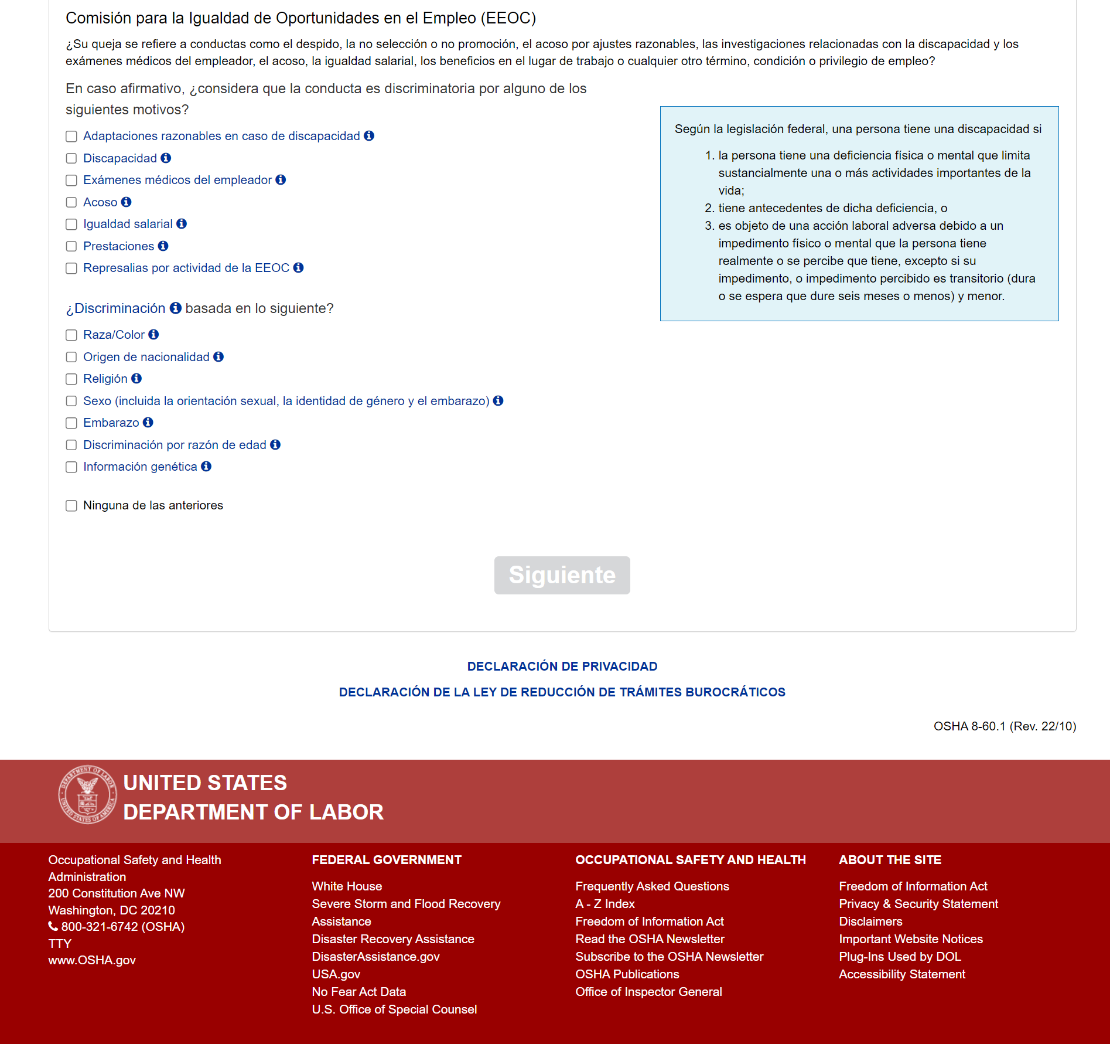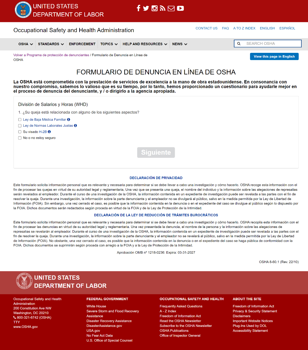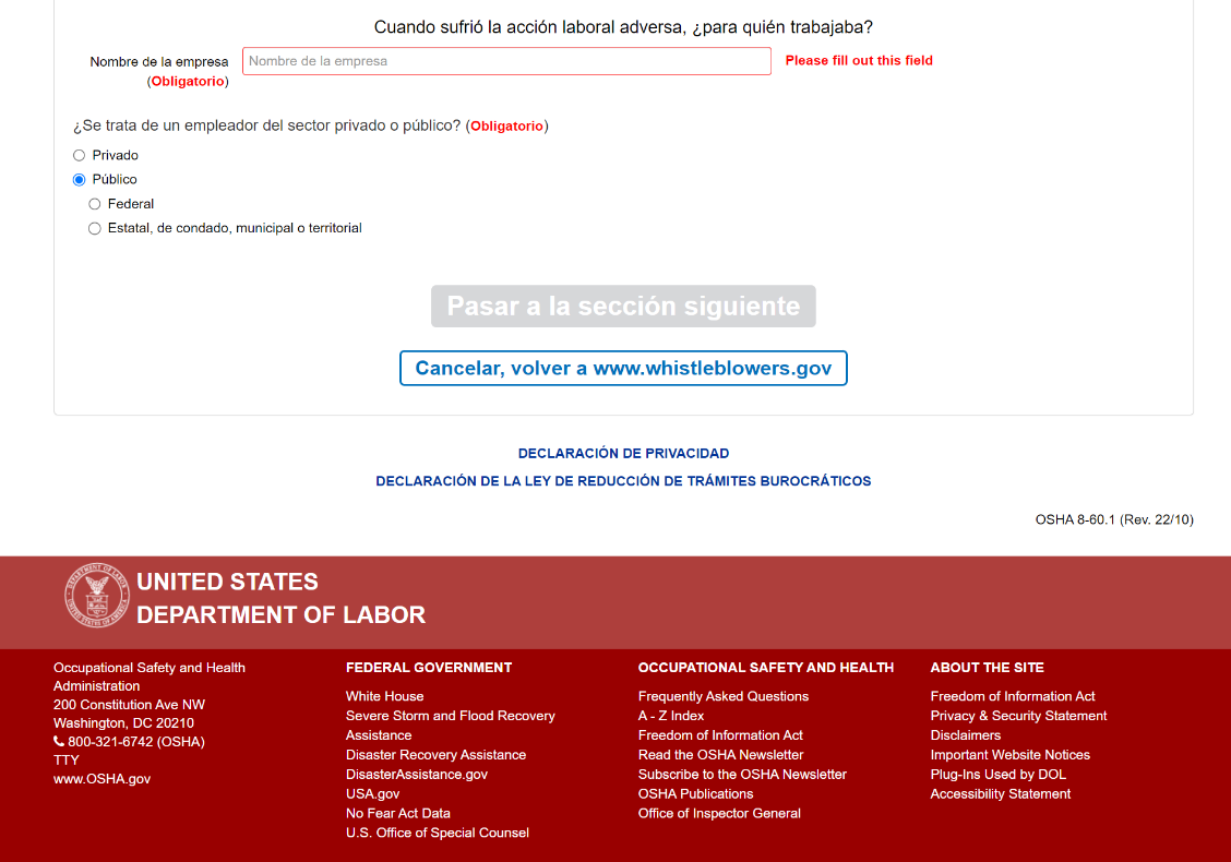 OSHA Whistleblowers Online Complaint Form