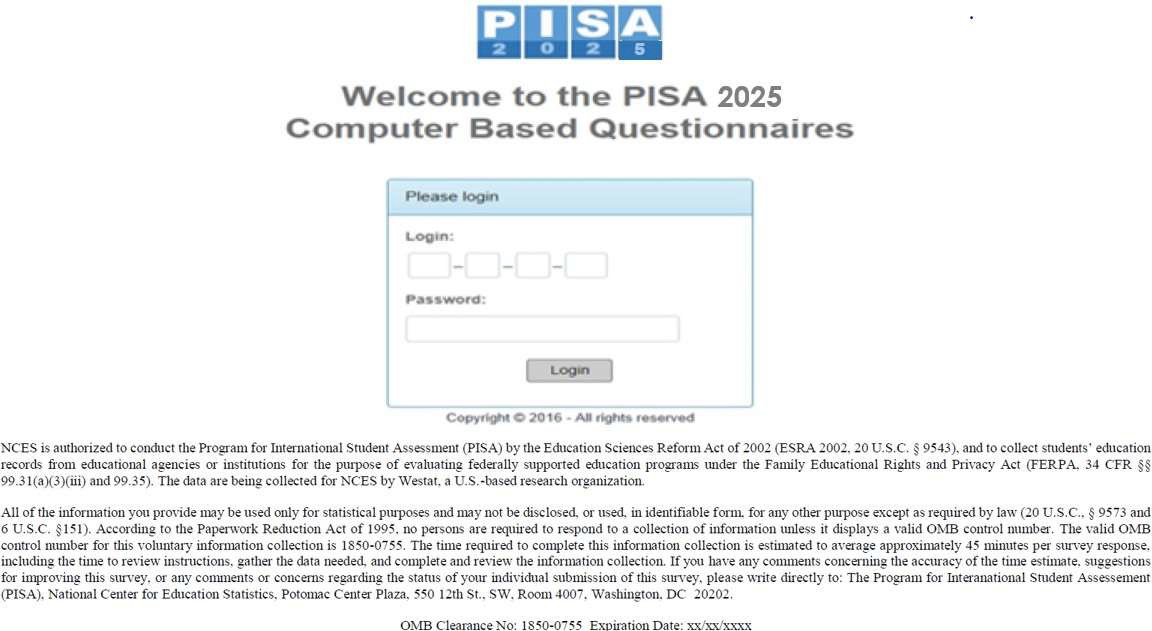 The National Center for Education Statistics (NCES) is authorized to conduct the Program for International Student Assessment (PISA) by the Education Sciences Reform Act of 2002 (ESRA 2002, 20 U.S.C. §9543), and to collect students’ education records from educational agencies or institutions for the purpose of evaluating federally supported education programs under the Family Educational Rights and Privacy Act (FERPA, 34 CFR §§ 99.31(a)(3)(iii) and 99.35). The data are being collected for NCES by Westat, a U.S.-based research organization. All of the information [you / your child] provide may be used only for the purposes of research, statistics, and evaluation under ESRA 2002 (20 U.S.C. §9573) and may not be disclosed, or used, in identifiable form for any other purpose except as required by law (20 U.S.C. §9573).