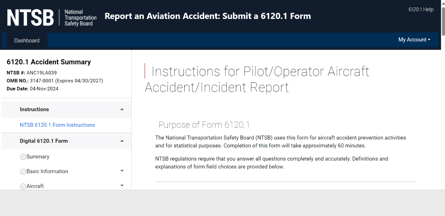 Since receiving approval for the Pilot/Operator Aircraft Accident/Incident Report form in April 2024 and for non-substantive changes in July 2024, the National Transportation Safety Board (NTSB) has created a digitized version of the form and made non-substantive changes to allow users to complete the form online.