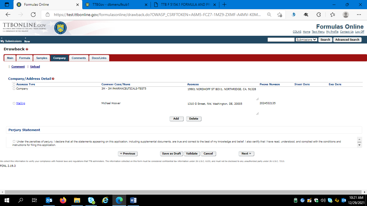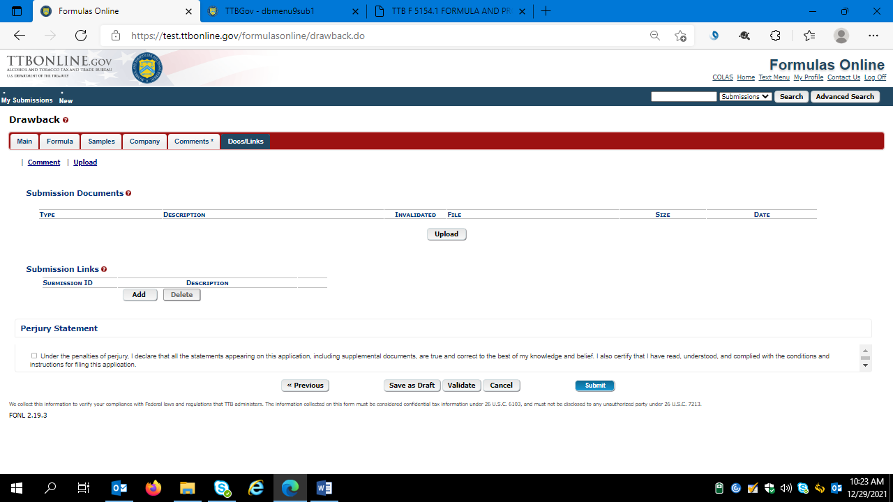 (Equivalent to TTB F 5154.1, Formula and Process for Nonbeverage Products)