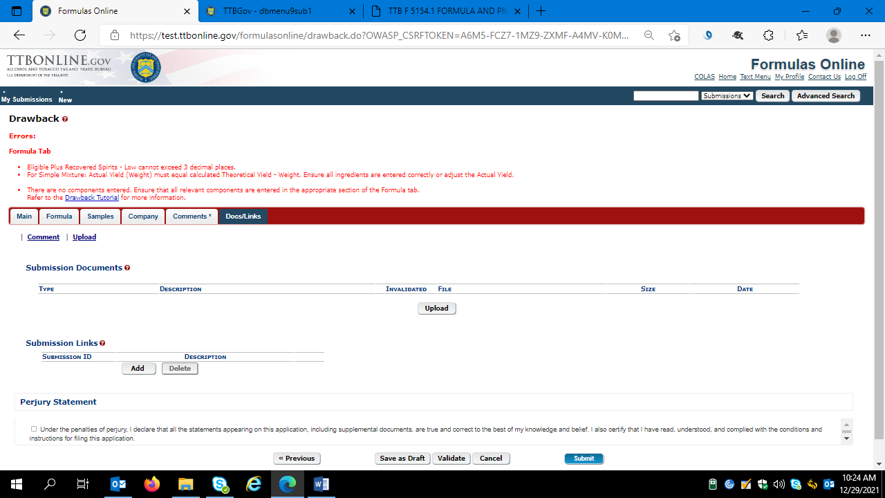 Clicking “Validate” causes the FONL system to generate a list of errors that require correction: