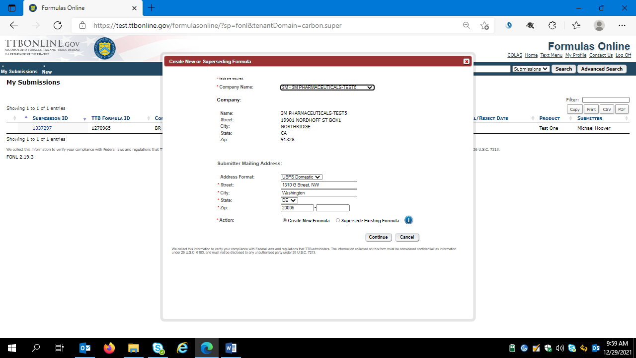 Selecting the appropriate company name from the drop down menu results in the company information auto-filling the dialog box, as shown below. The user selects “Continue” to proceed: