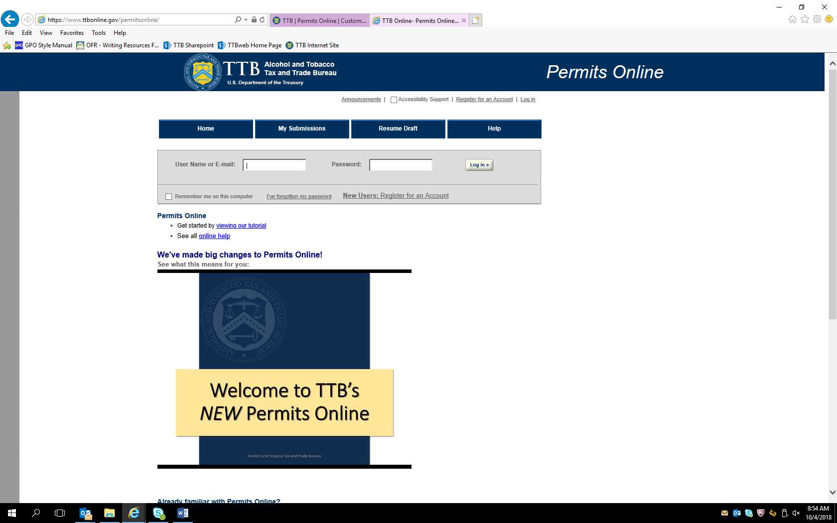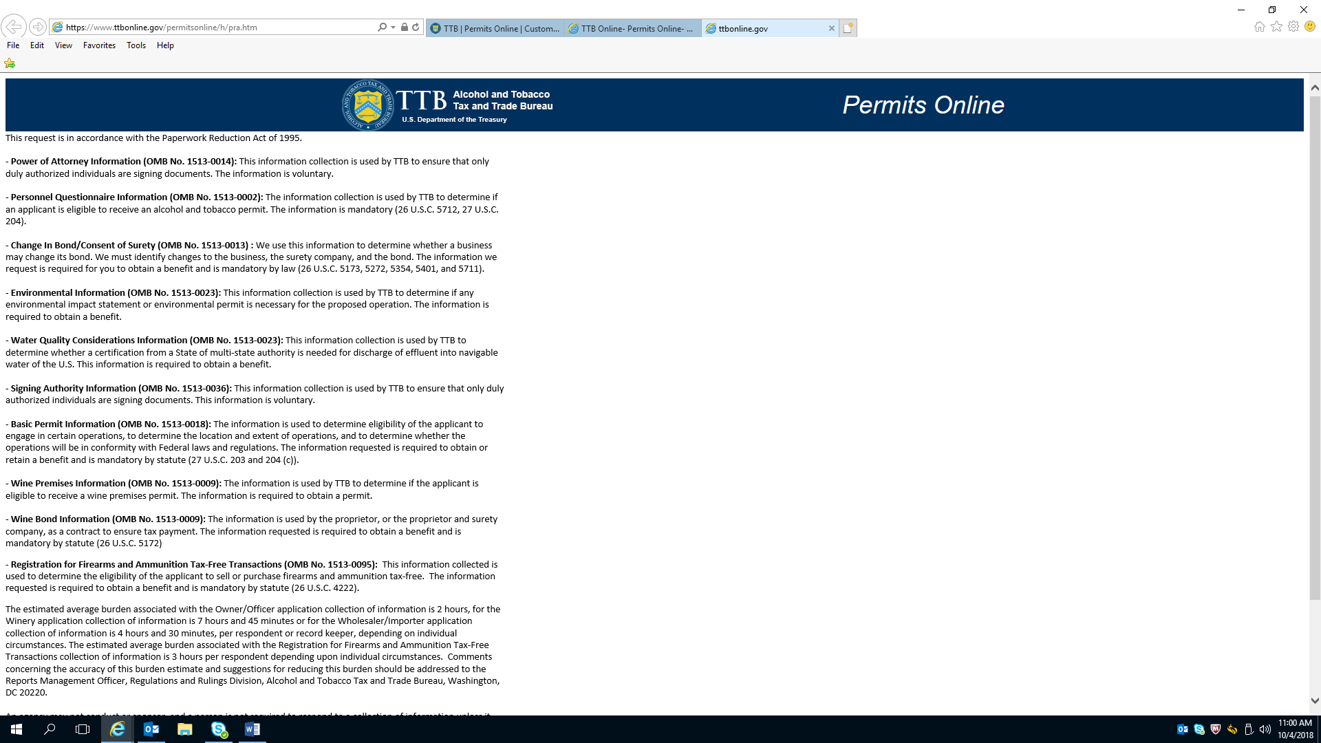 Permits Online (PONL), New Distilled Spirits or Bonded Wine Premises Applications — for OMB Control No. 1513–0018, Application for Basic Permit under the Federal Alcohol Administration Act).