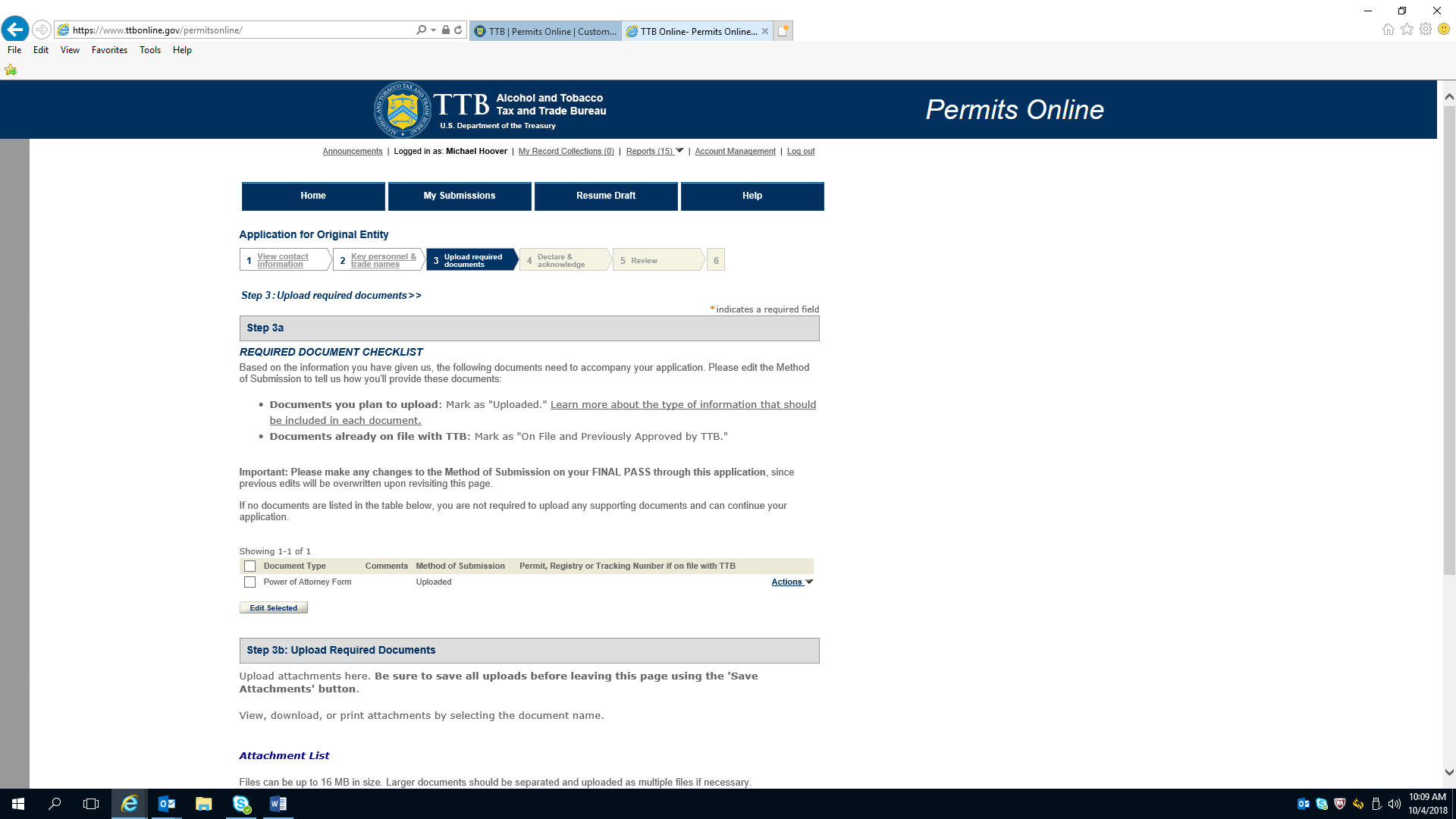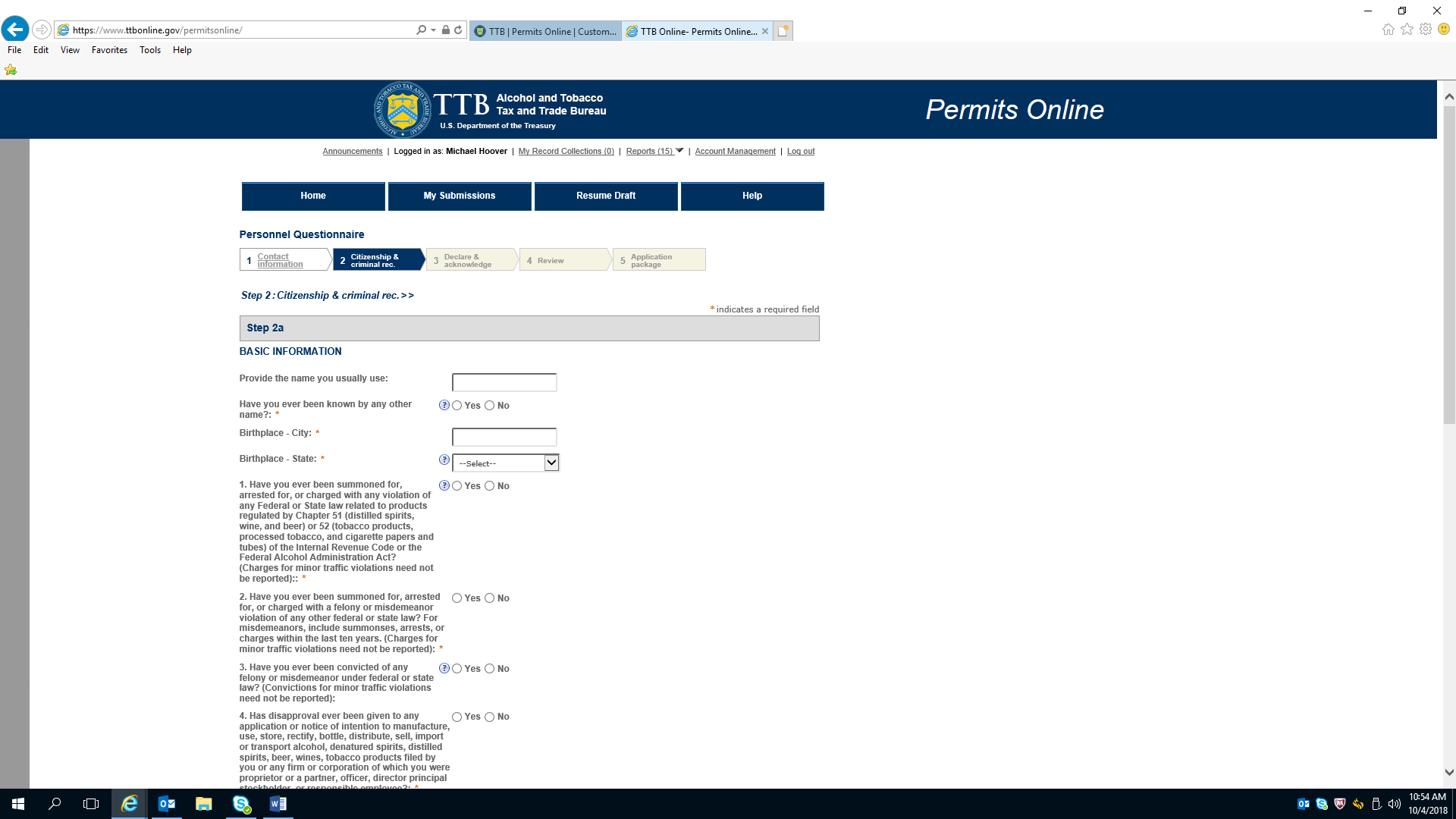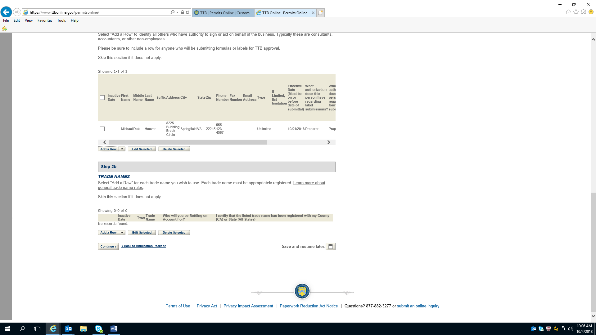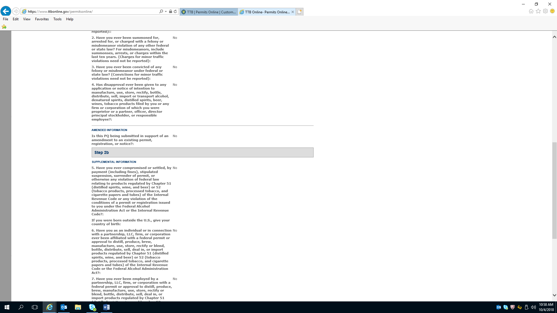 Permits Online Screen Shots — New DSP or Bonded Wine Premises FAA Act Basic Permit Applications (OMB Control No. 1513–0018) (10-2018)