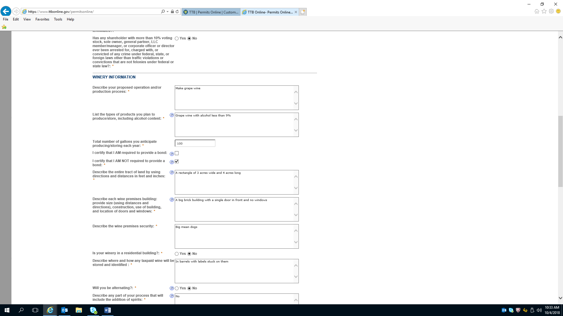 This PONL application is equivalent to TTB F 5100.24, Application for Basic Permit under the Federal Alcohol Administration Act, for new beverage Distilled Spirits Plants and Bonded Wine Premises applications on that form. New Winery application used as example; application for new Distilled Spirits Plant collects the same data.