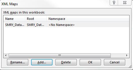 1. Then select ‘OK’ on the ‘XML Maps’ dialog box. After selecting ‘OK’, the data elements will populate in the right-hand pane. We will map each of the tables to a separate tab. For reference, label nine tabs according to the nine sets of data being collected.