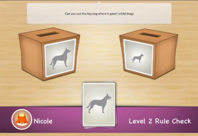 This image shows a screenshot of how the MEFS would appear on a child's technical device. The image includes a speech bubble at the top that reads, "Can you put this dog where it goes?” with a prompt for the child to drag the image to the correct box. There are two boxes that each have a slot at the top and a picture on the front. The left box shows a picture of a big dog, and the right box shows a picture of a small dog. Between these two boxes, the top card on a stack of cards shows a picture of a large dog. At the bottom of the image is a purple ribbon where the child's name and MEFS avatar (a fox) is in the lower left corner and the words, “Level 2 Rule Check,” are the lower right corner.
